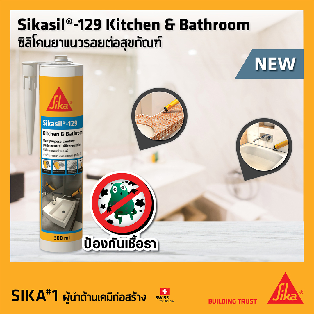 Sikasil-129 Kitchen & Bathroom เป็นกาวยาแนวซิลิโคนแบบส่วนผสมเดียวที่ออกแบบมาเพื่อใช้งานยาแนวรอยต่อสุขภัณฑ์ โดยมีสมบัติเด่นคือ ทนเชื้อรา เหมาะกับสภาพอากาศร้อน และอับชื้น ใช้งานได้ทั้งภายในและภายนอกอาคาร เหมาะสำหรับห้องน้ำ ห้องครัว พื้นที่เปียกชื้น และรอบขอบกระเบื้อง สุขภัณฑ์ หรือวัสดุหลายประเภท